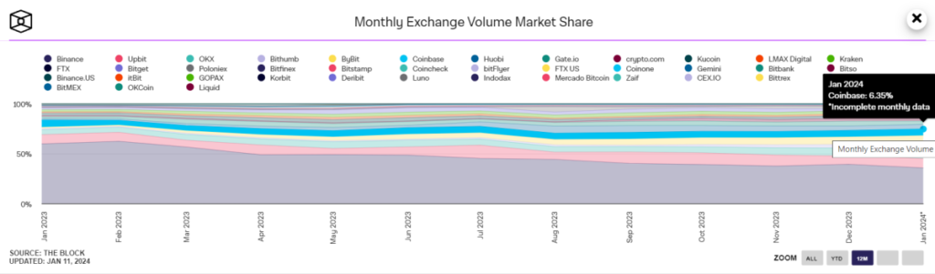 If we examine with different exchanges, Coinbase was one of many exchanges with probably the most constant change in market share final yr. Take Binance for instance. It stays the biggest trade, however has misplaced about 25% of its market share, falling from 59% in January 2023 to 35% at this time.